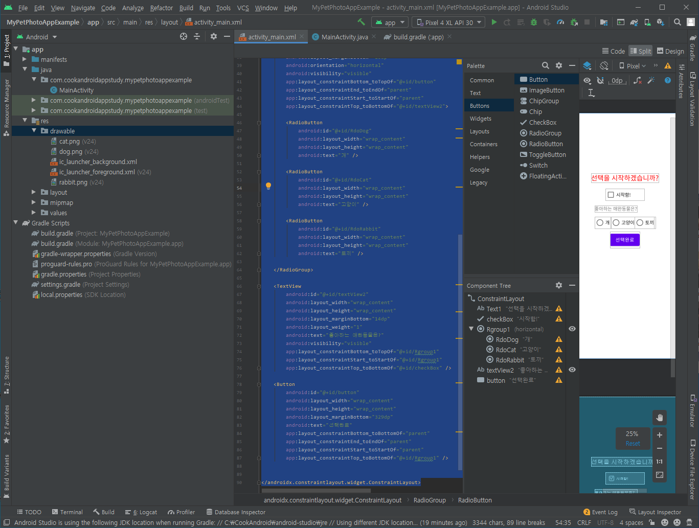 rdoDog = (RadioButton)findViewById(R.id.RdoDog); // 라디오버튼 : Dog