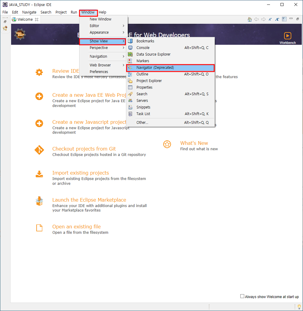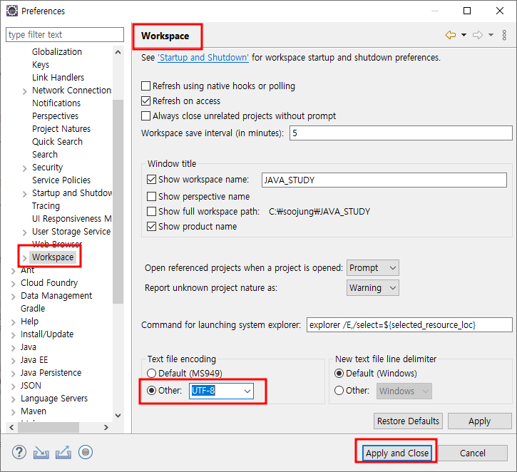 eclipse.exe 실행 > workspace 브라우저 폴더 지정(작업폴더 지정)