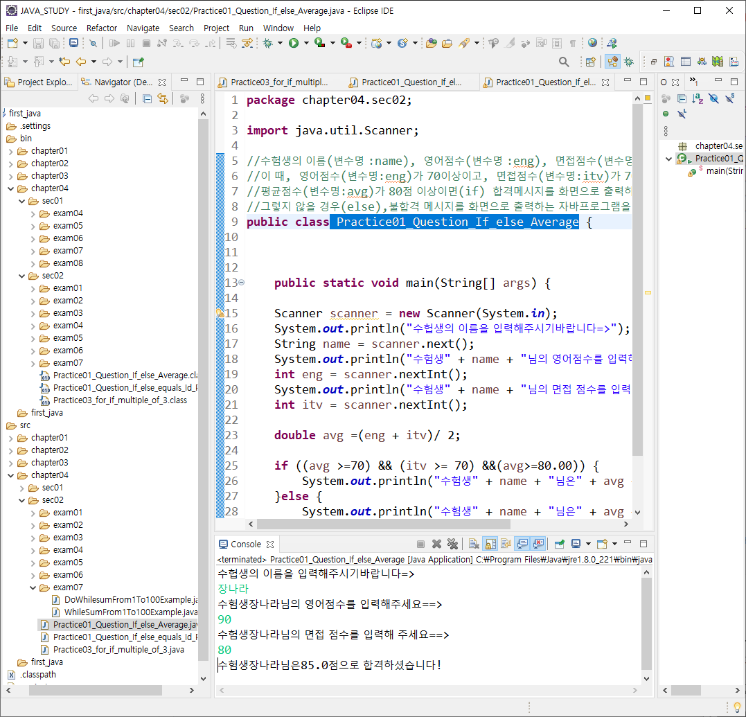 //그렇지 않을 경우(else),불합격 메시지를 화면으로 출력하는 자바프로그램을 소스코딩하시기 바랍니다.
