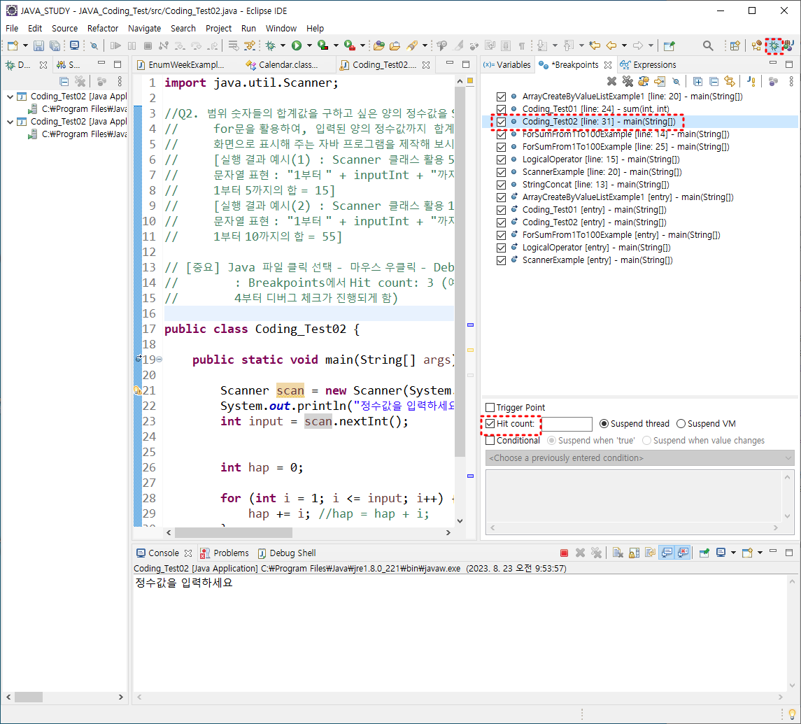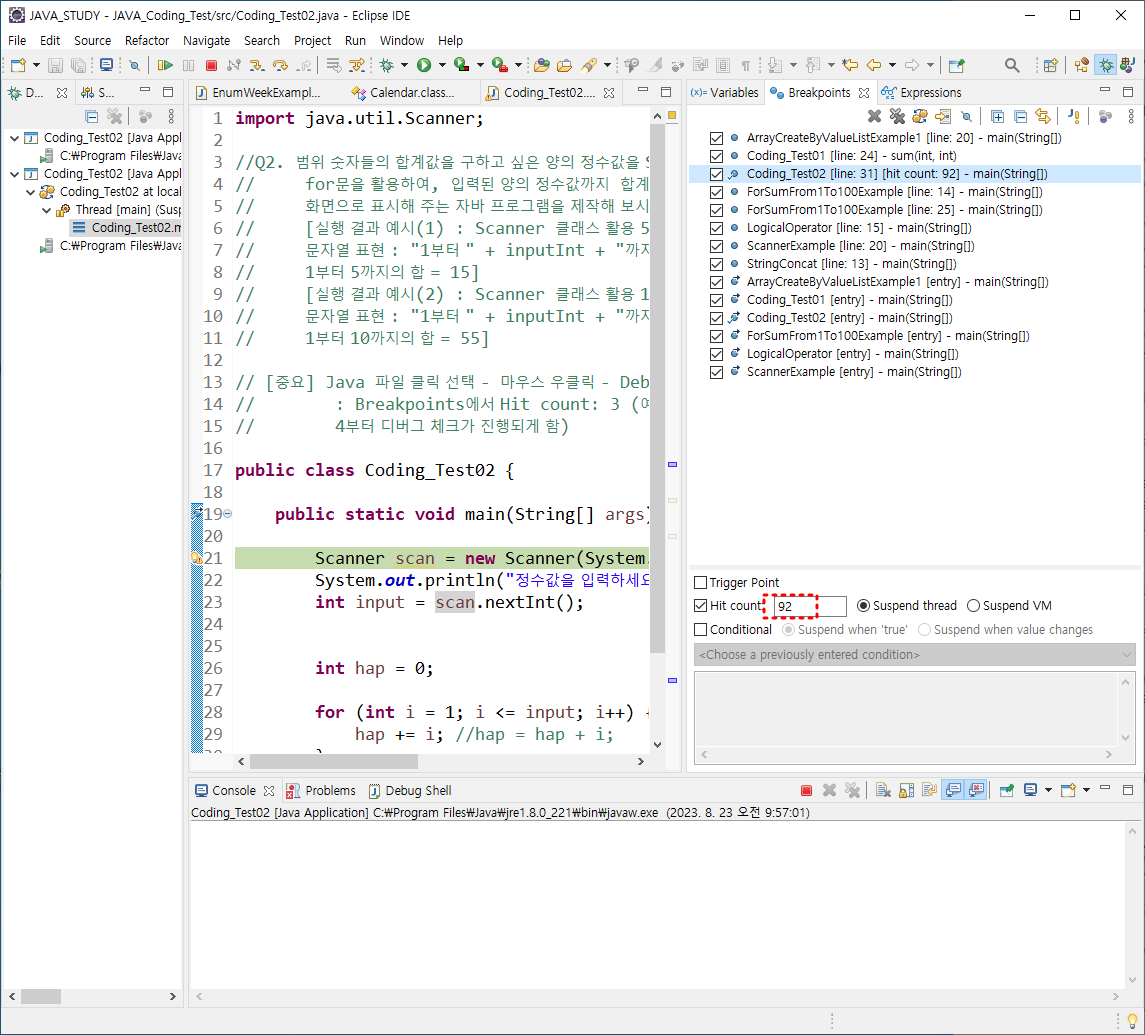 // [중요] Java 파일 클릭 선택 - 마우스 우클릭 - Debug As - Java Application