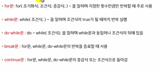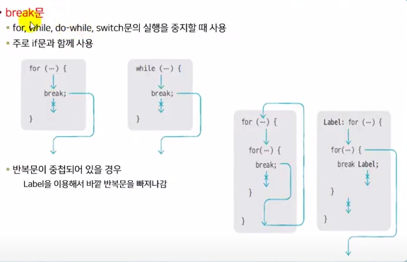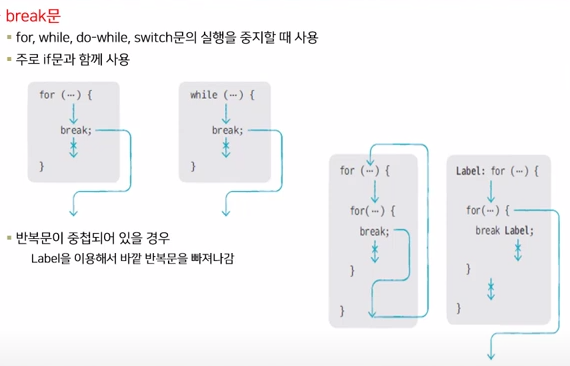 반복문인 for문, while문, do-while문의 실행을 중지할 때 사용, 반복 취소