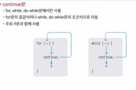 블록 내부에서 continue문이 실행되면 for문의 증감식 또는 while문, do-while문의 조건식으로 이동한다.