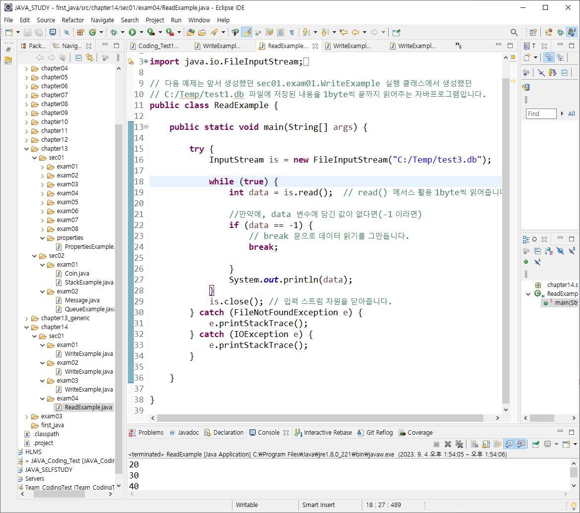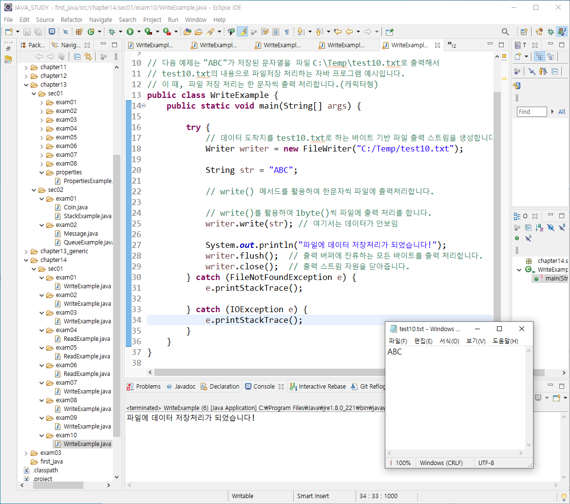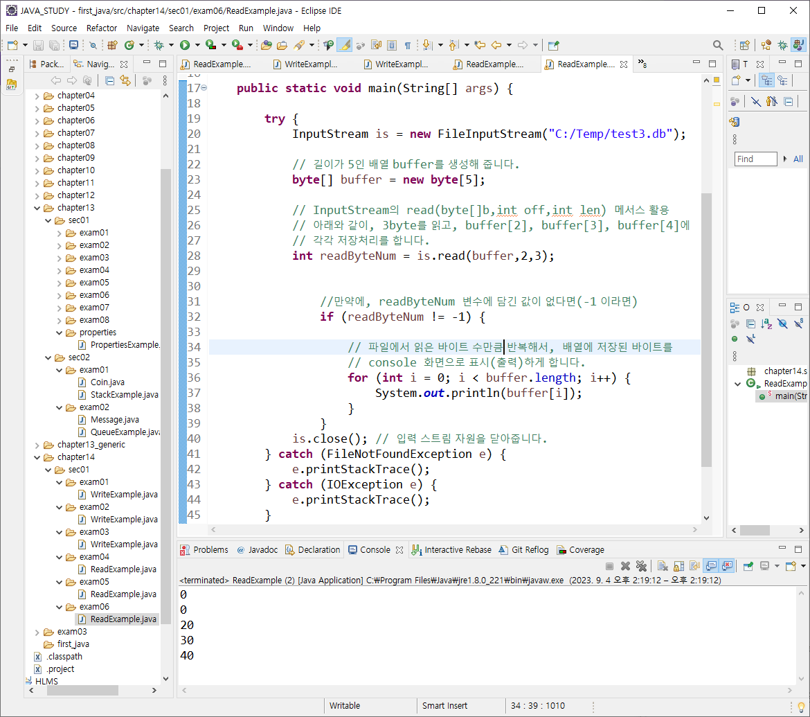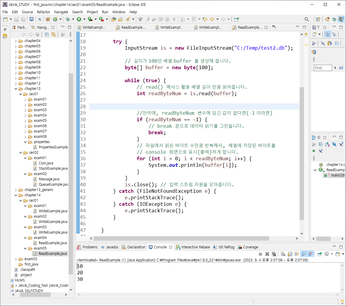 // 다음 예제는 앞서 생성했던 sec01.exam09.WriteExample 실행 클래스에서 생성했던