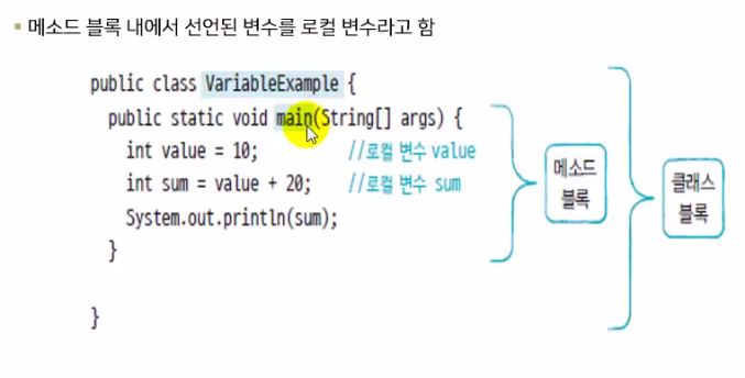 - 메소드 블록 전체에서 사용하고 싶다면, 메소드 블록 첫머리에 선언한다.