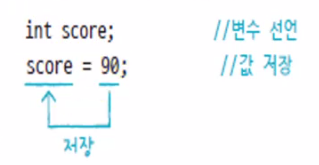 int score = 90; // 변수 선언과 동시에 값을 저장할 수 있다.