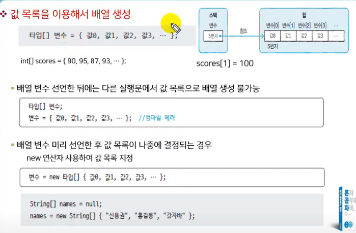 //값 목록으로 배열 생성을 하는 자바 프로그램 소스 코딩입니다.