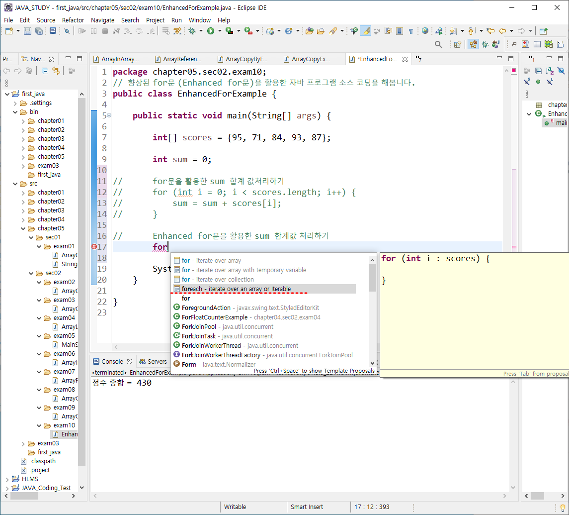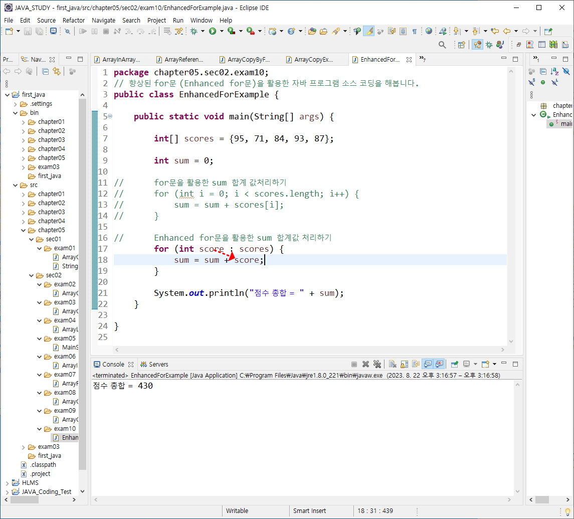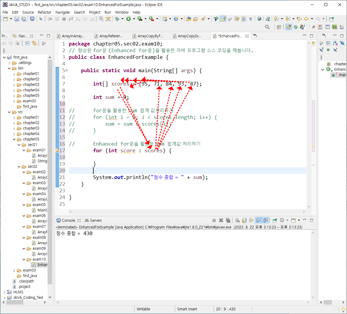 System.out.println("점수 총합 = " + sum); // 점수 총합 = 430