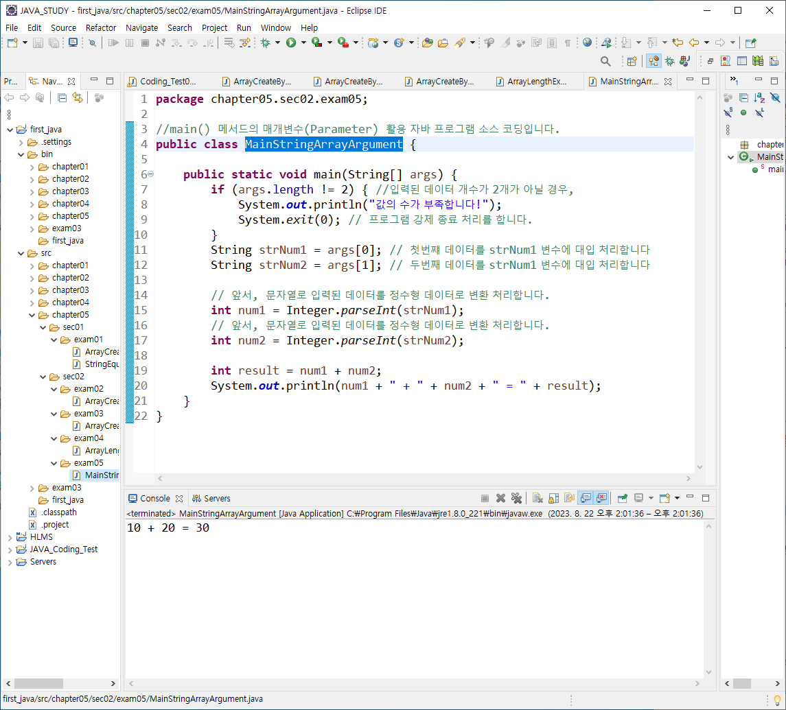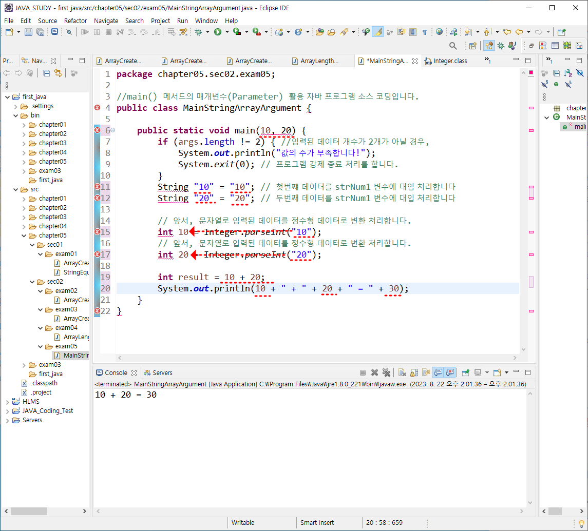 이렇게 실행하면 arg는 {10, 20}배열을 참조하게 되고 args[0]은 "10", args[1]은 "20"을 얻을 수 있다.