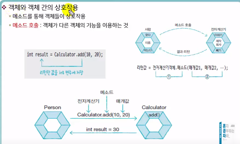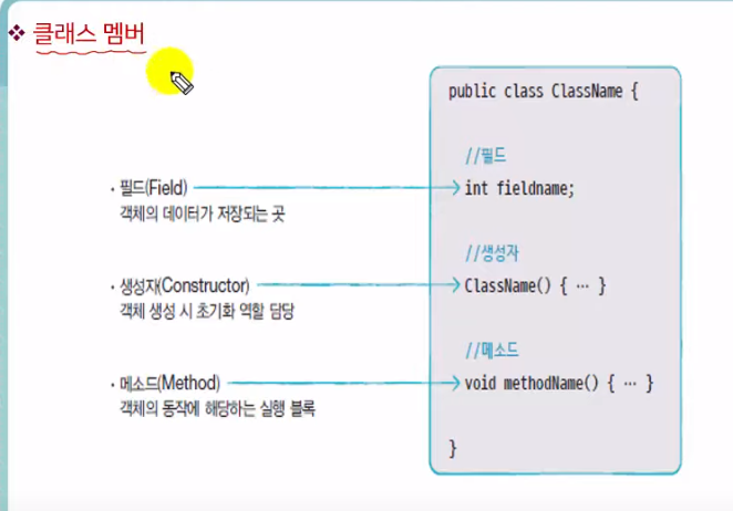 메소드(동작): 동작에 해당하는 중괄호 블록, 일괄적으로 실행