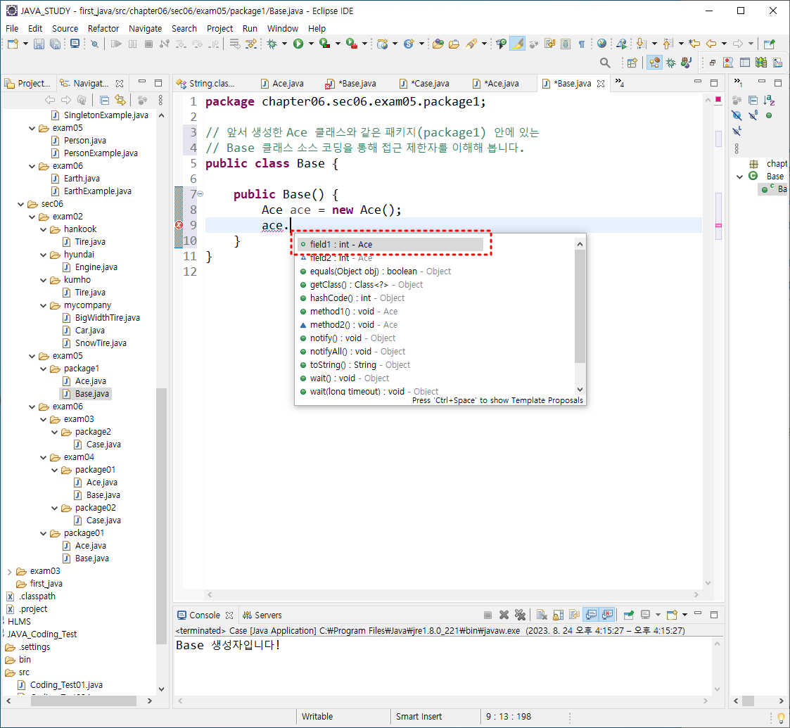 // ace.field3 = 1; // Ace 클래스에서 private 접근 제한자로 설정된 field3 필드는 접근하지못함