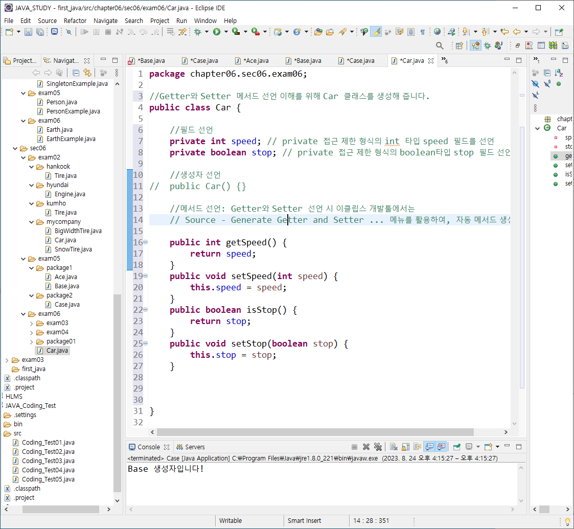 // Source - Generate Getter and Setter ... 메뉴를 활용하여, 자동 메서드 생성이 가능