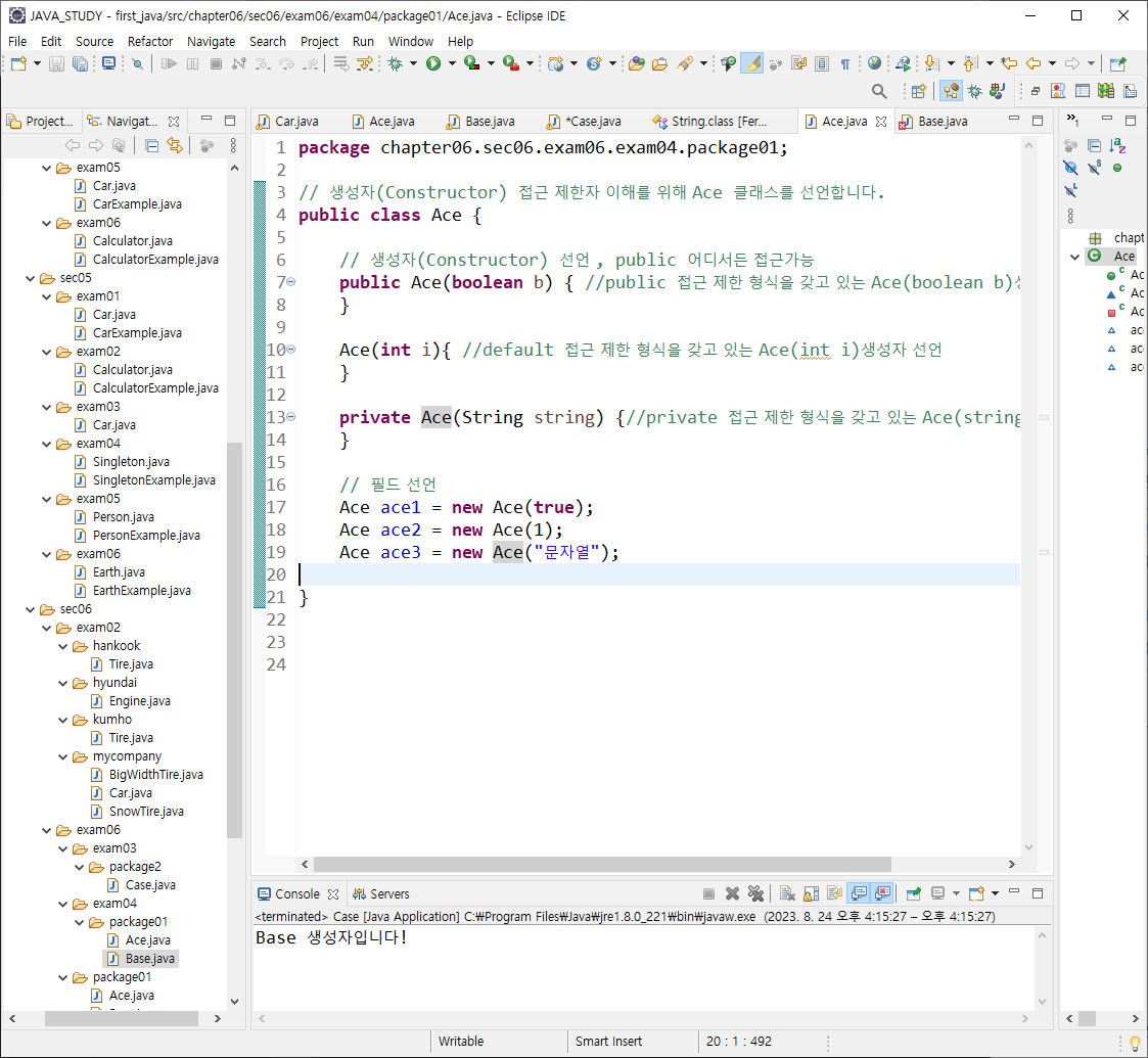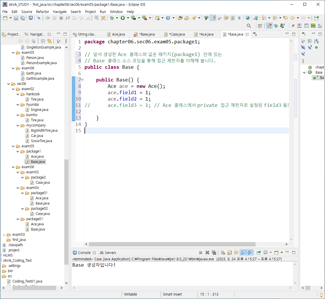 // Base 클래스 소스 코딩을 통해 접근 제한자를 이해해 봅니다.