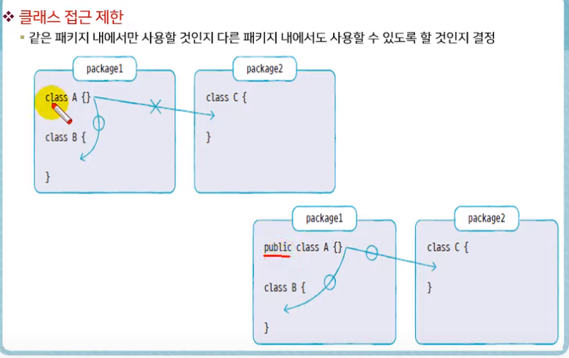public : 공용 접근제한, 인터넷으로 배포되는 라이브러리 클래스는 모두 public 접근 제한을 가지고있다.
