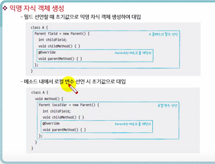 부모클래스 [필드| 변수] = new 부모클래스(매개값,...) {