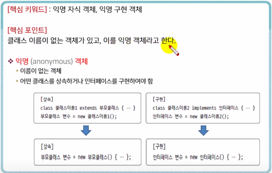 이름없는 객체, 어떤 클래스를 상속하거나 인터페이스를 구현해야한다.