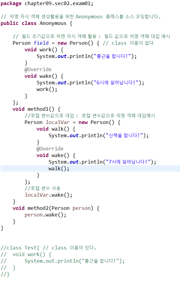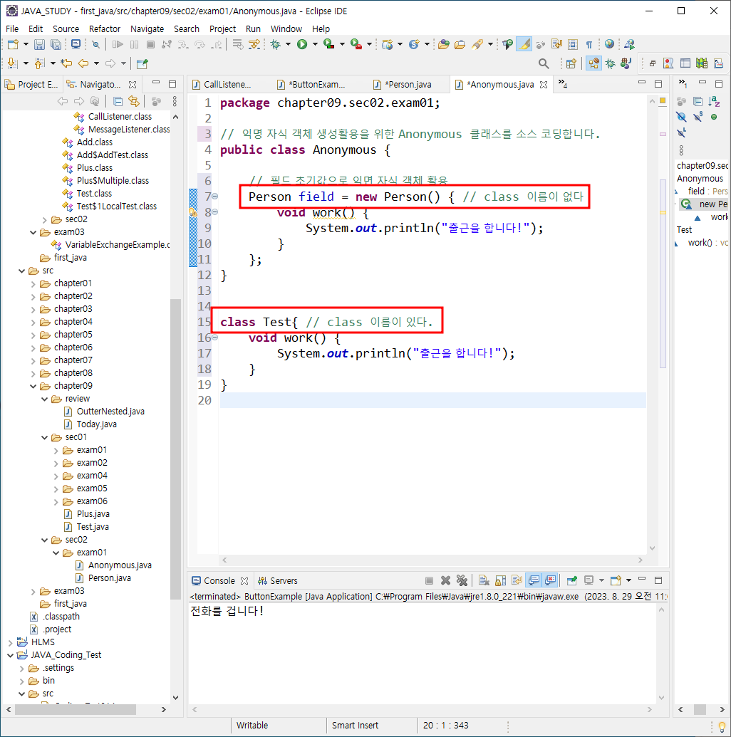 // 익명 객체의 로컬 변수 사용 AnonymousExample 실행 클래스를 소스 코딩합니다.