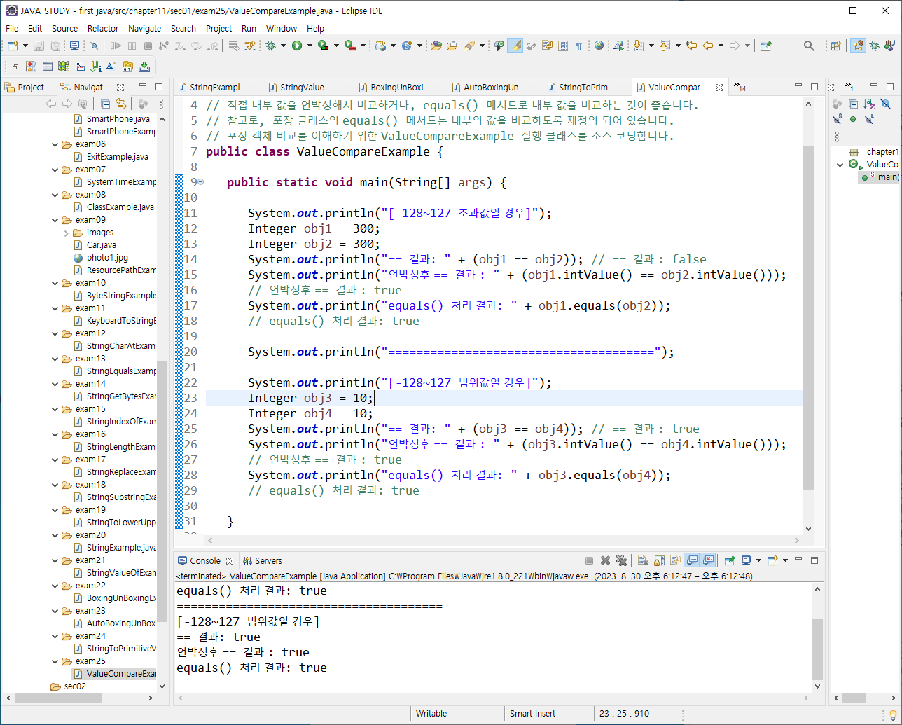 // 포장 객체 비교를 이해하기 위한 ValueCompareExample 실행 클래스를 소스 코딩합니다.