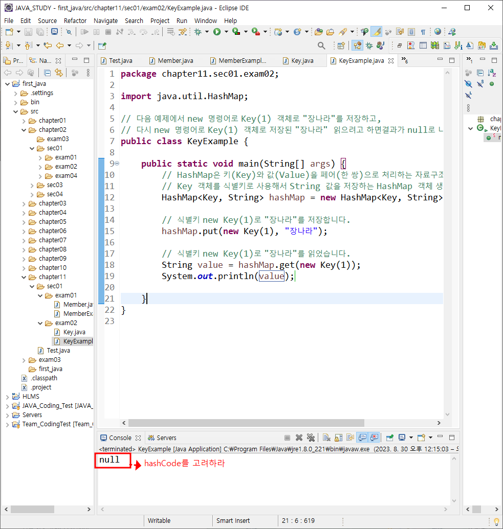 // 다시 new 명령어로 Key(1) 객체로 저장된 "장나라" 읽으려고 하면결과가 null로 나타나느것을 확인해봅니다.
