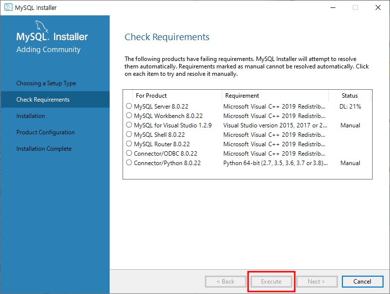 많은데, 이 경우 [Execute] 버튼을 클릭해서 먼저 비주얼 C++ 런타임을 설치해야 합니다.