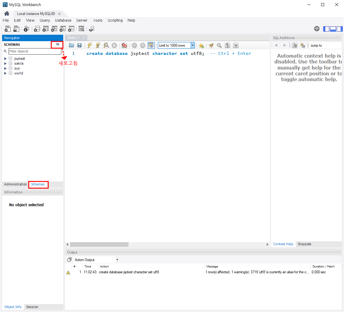 데이터베이스를 생성했다면 스키마 영역의 새로고침 아이콘을 클랙해 봅니다.