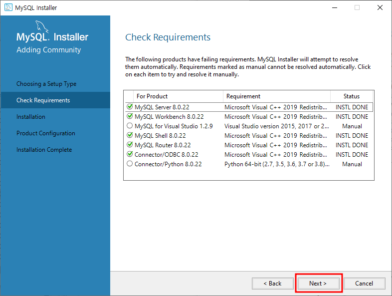 2) MySQL Workbench를 설치하려면 비주얼 C++ 런타임 환경이 필요합니다.