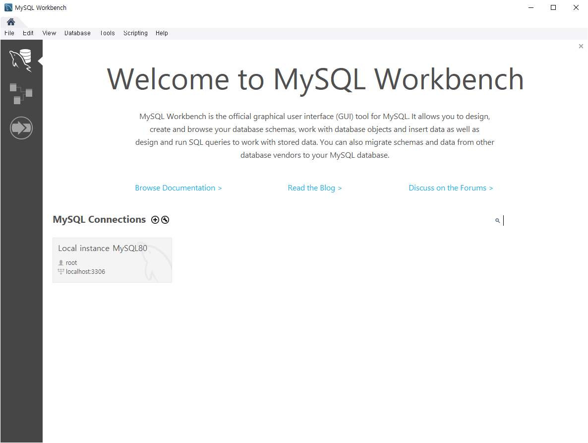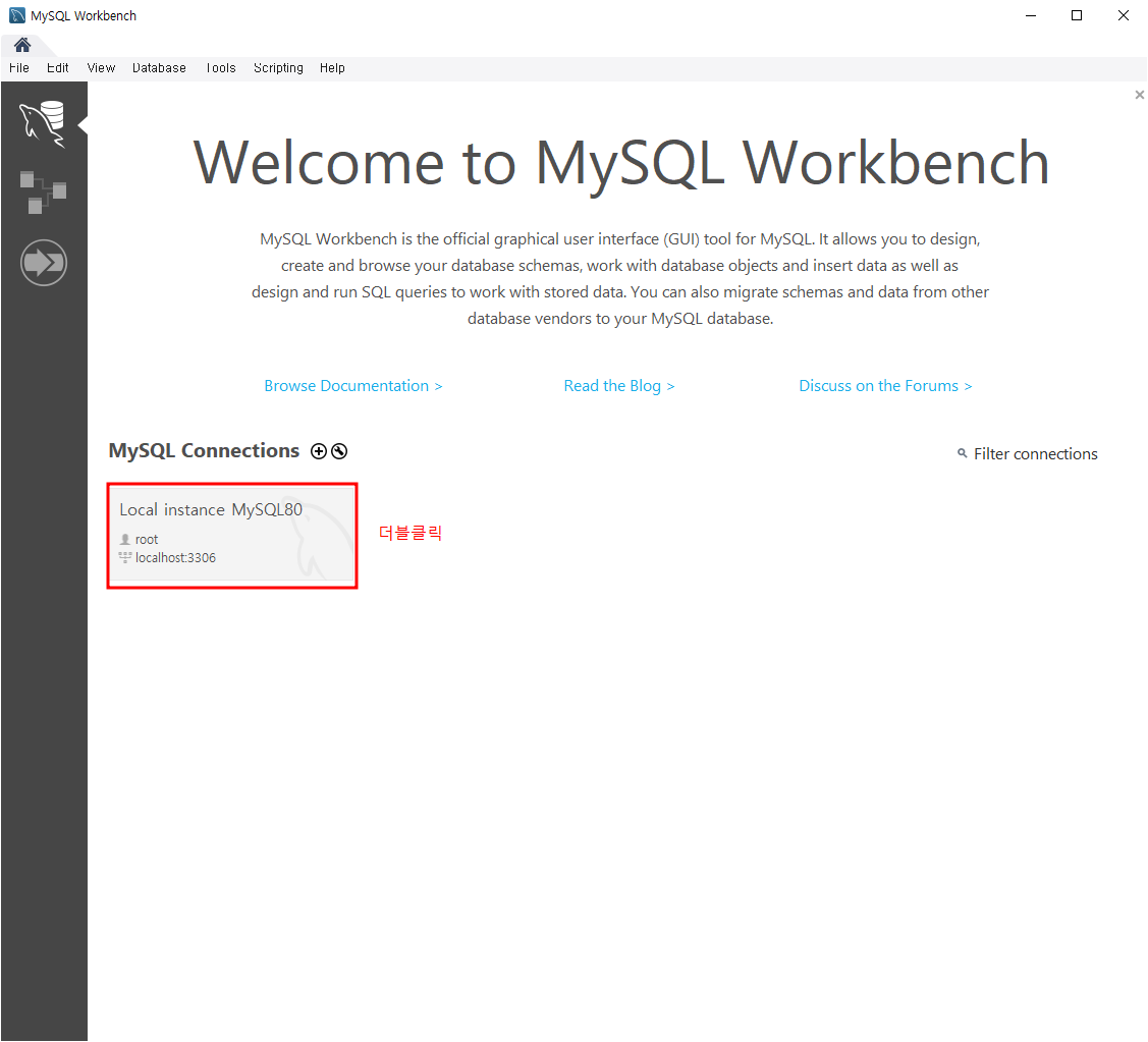 커넥션 목록에 "Local instance MySQL80"이 보일 것입니다. 이는 앞서 설치한 MySQL 서버에 대한