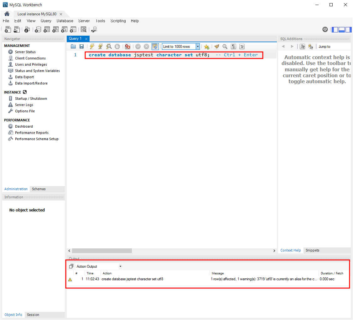 create database jsptest character SET utf8; -- Ctrl + Enter