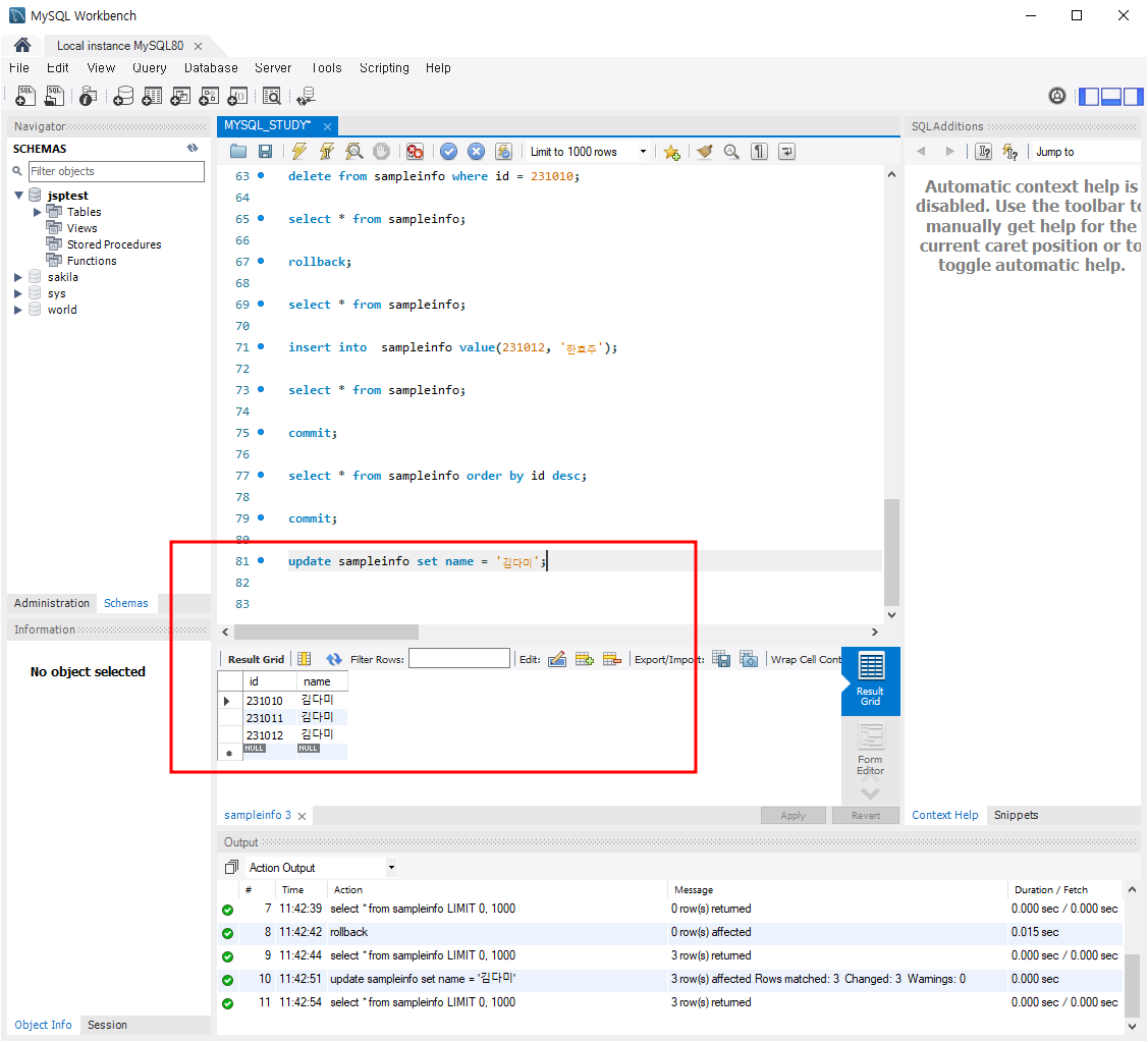 쿼리 영역에서 쿼리를 실행하면 됩니다. 예를 들어, 데이터베이스 목록에서 jsptest를