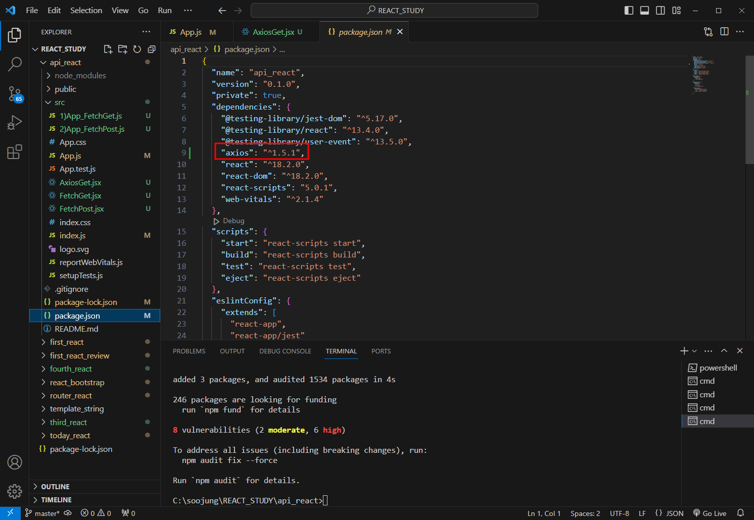 // axios.post('호출 url', json 데이터) 문법으로 post 방식의