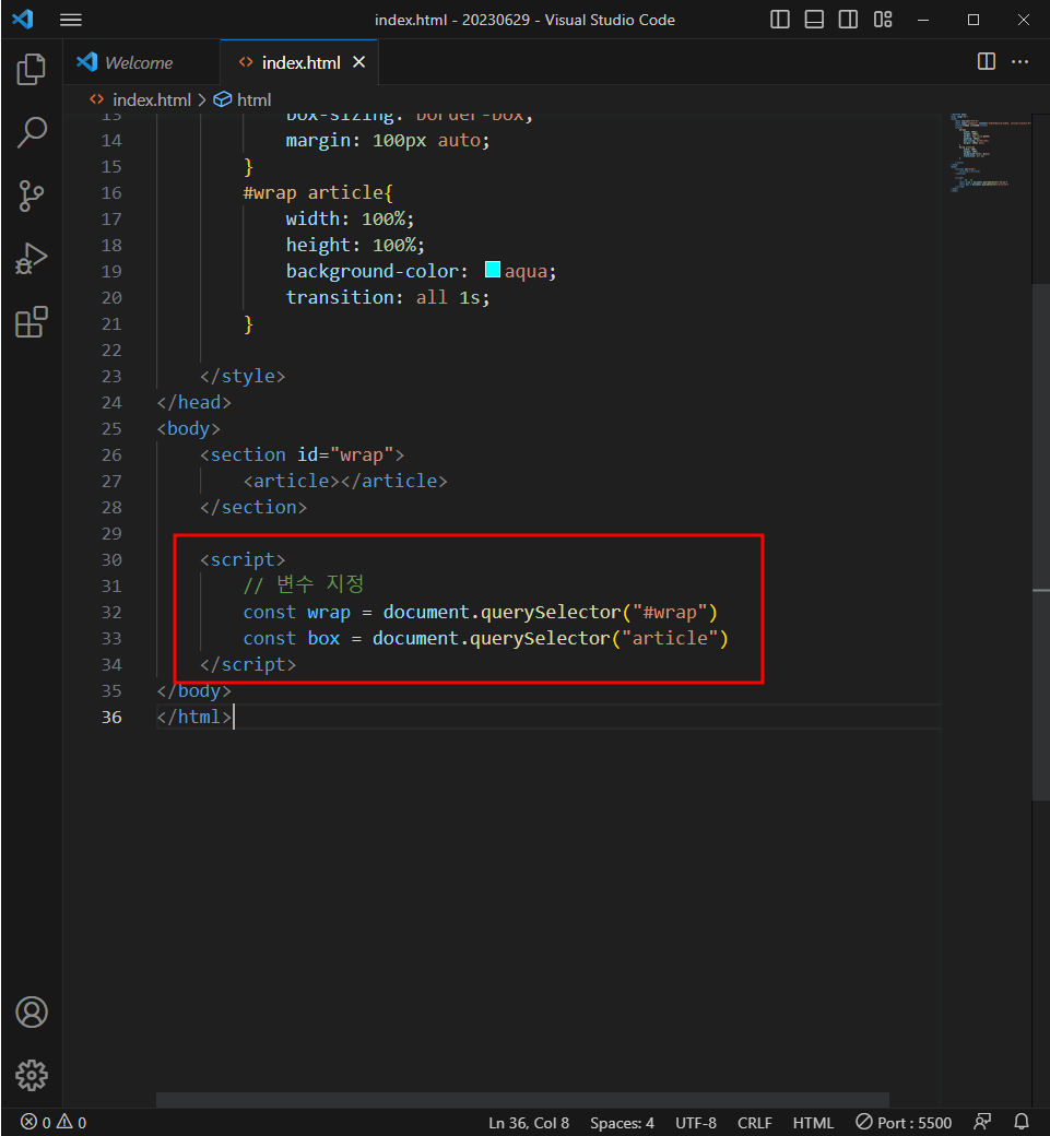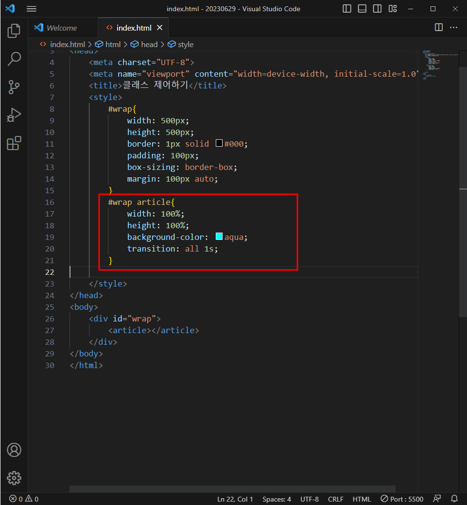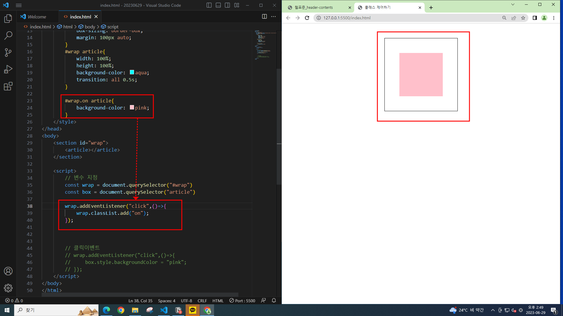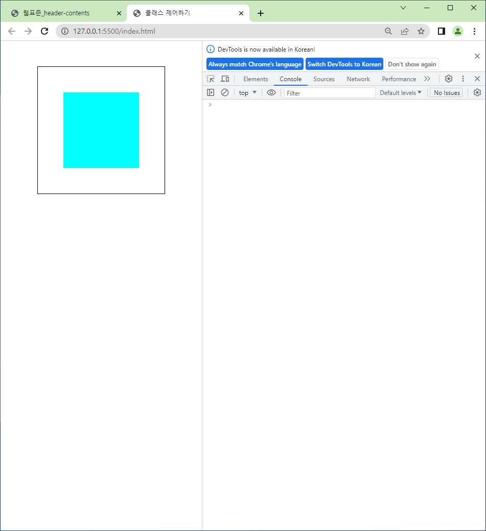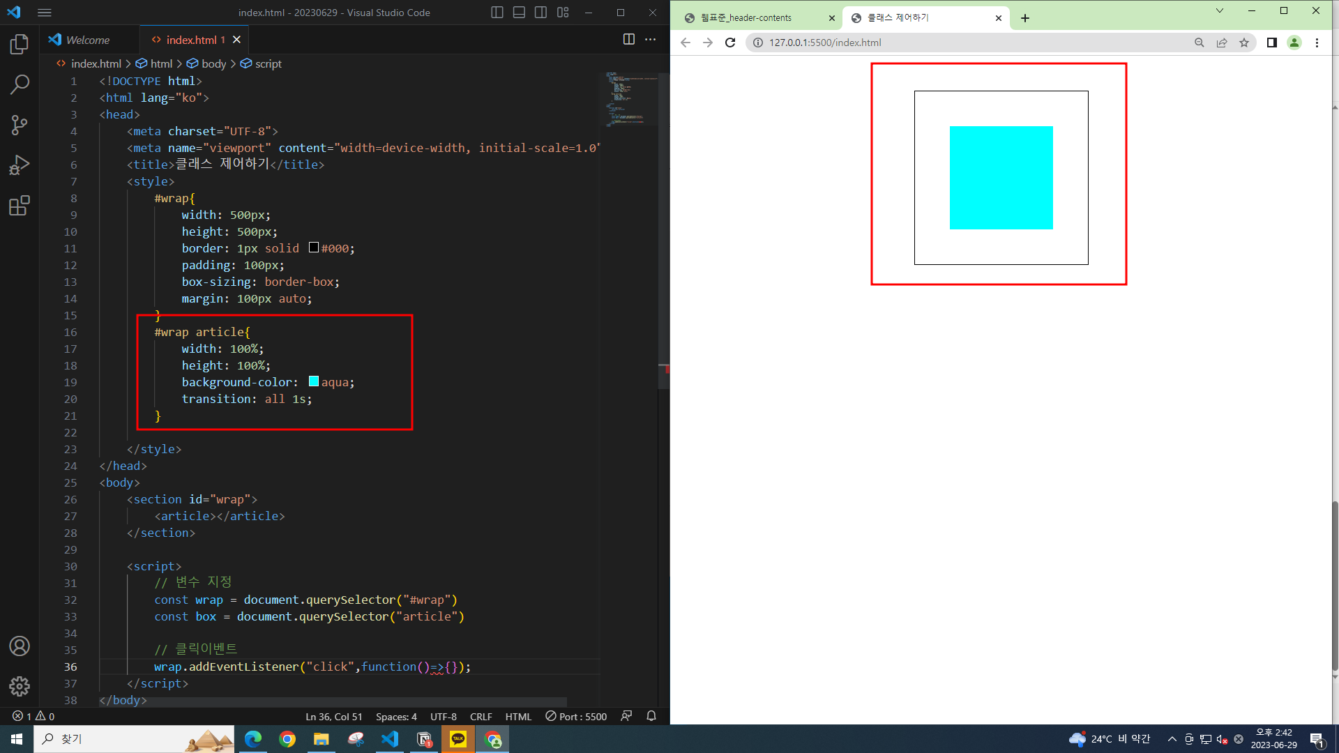 자바스크립트로 박스안에 아쿠아색 클릭했을 때 핑크로 변경하기