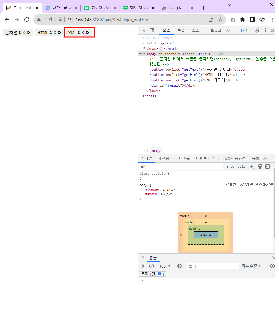 //ajax 통신 활용 data3.xml 파일 문자열 인식 소스 코딩