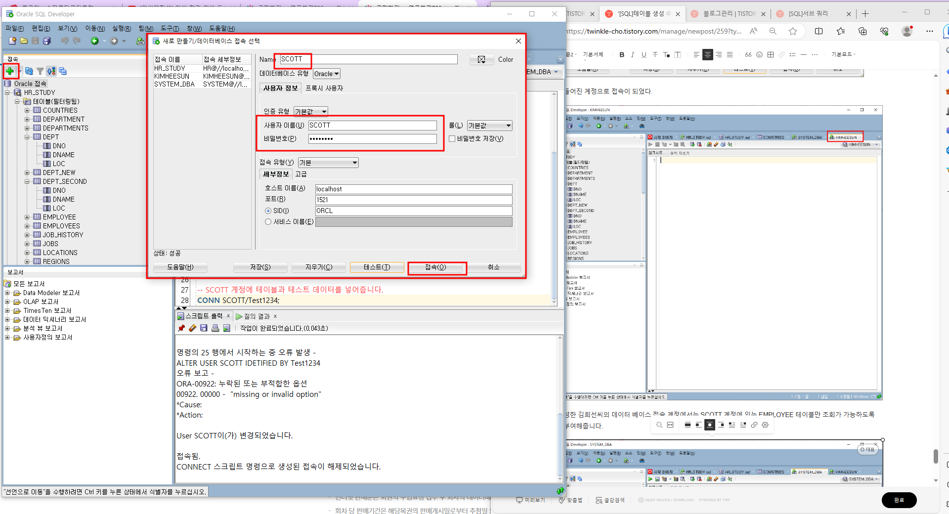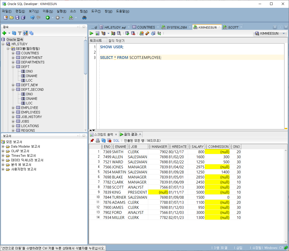 -- 신입사원 김희선씨의 DB 접속 계정에서는 SCOTT계정에 있는