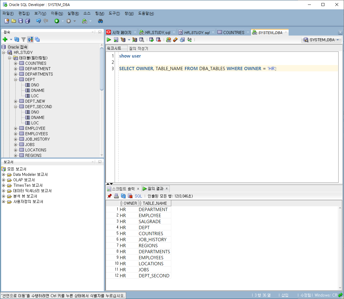 SELECT OWNER, TABLE_NAME FROM DBA_TABLES WHERE OWNER = 'HR';