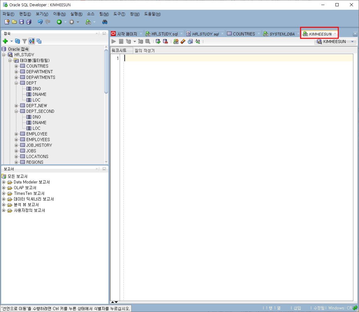 -- 새로 생성한 KIMHEESUN계정에 데이터 베이스 연결 SESSION 권한 부여
