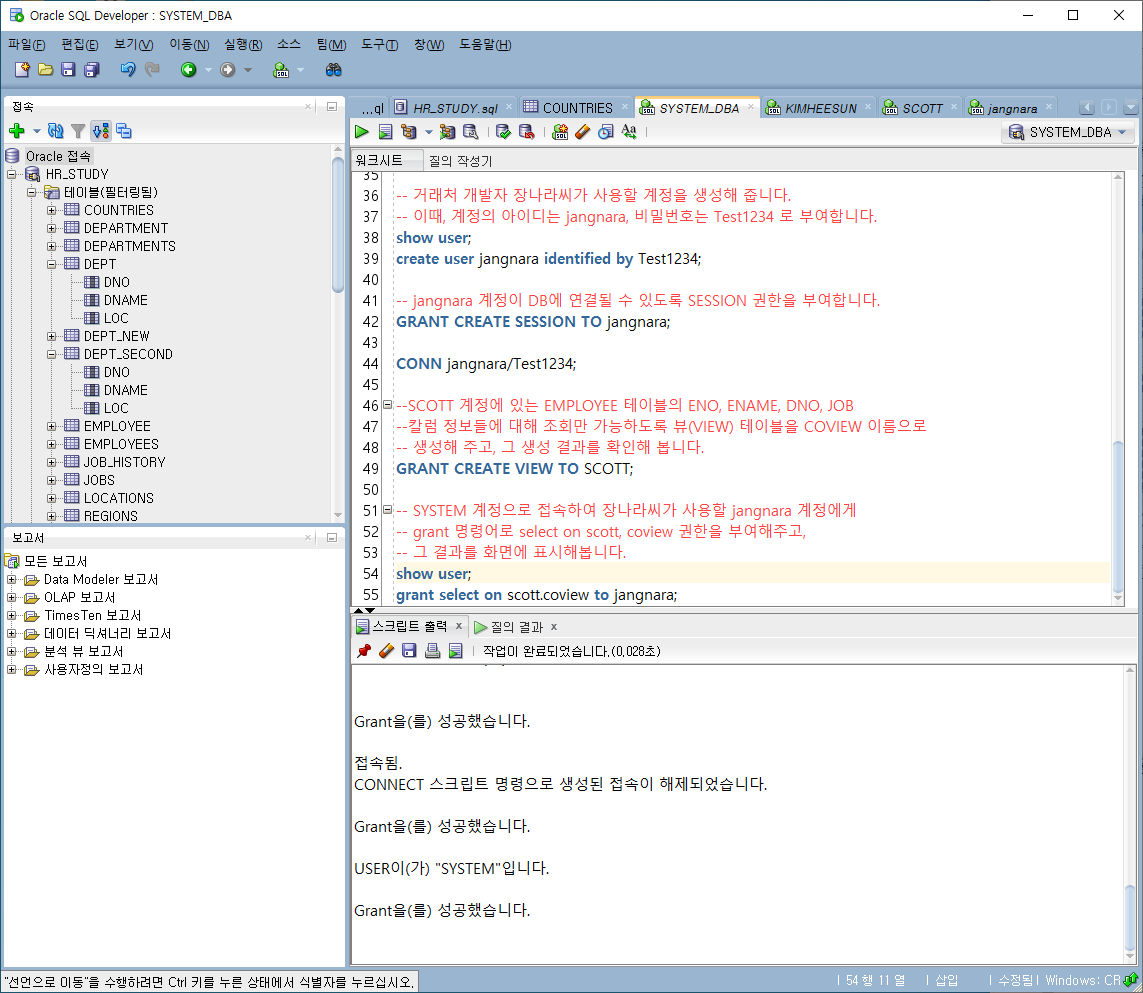 -- grant 명령어로 select on scott, coview 권한을 부여해주고,