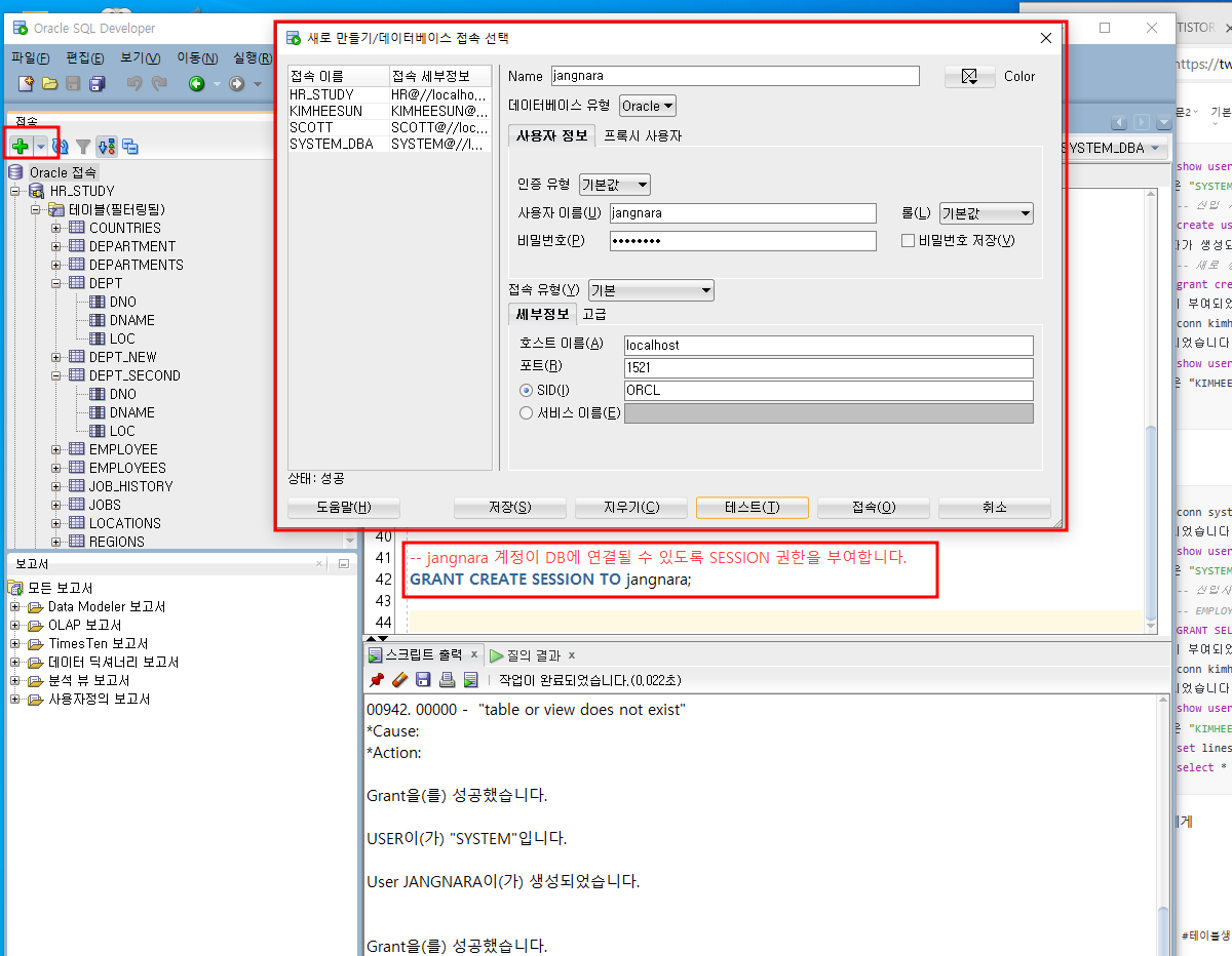 -- jangnara 계정이 DB에 연결될 수 있도록 SESSION 권한을 부여합니다.