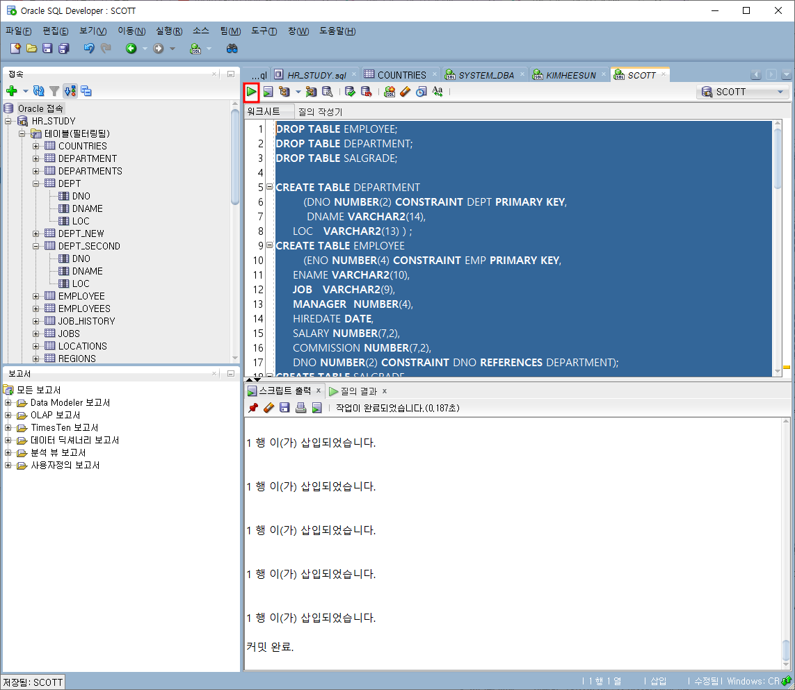 -- SCOTT 계정에 테이블과 테스트 데이터를 넣어줍니다.